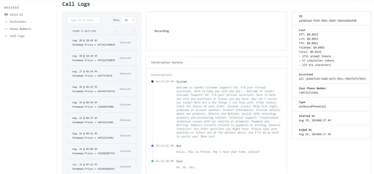 <div data-full-width="true"><figure><img src="https://1071261174-files.gitbook.io/~/files/v0/b/gitbook-x-prod.appspot.com/o/spaces%2Fvf94LWPujeVCvHrvFOc9%2Fuploads%2FDdOOITNJ3Xnj6pyiq3fi%2Ftelemanplus_voice_AI-call_logs.png?alt=media&#x26;token=a5ea35fb-f1e4-4228-99d7-81c2f7849897" alt=""><figcaption></figcaption></figure></div>